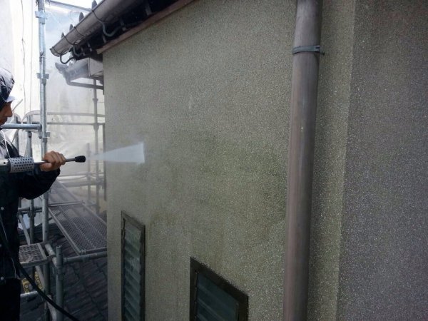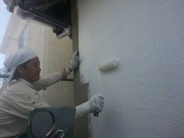 ![]() お家の塗り替え工事の際は、まず高圧洗浄で表面を念入りに洗います。仕上がり・耐久性を高めるための大事な下地処理です! | ![]() そして下塗り。 リシン系の外壁にはマスチック仕上げという下塗り方法が最適です。塗膜が厚く細かいヘアークラック(ヒビ)はこれでカバーできます!(^^)! |