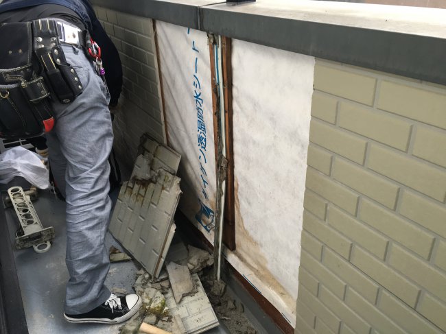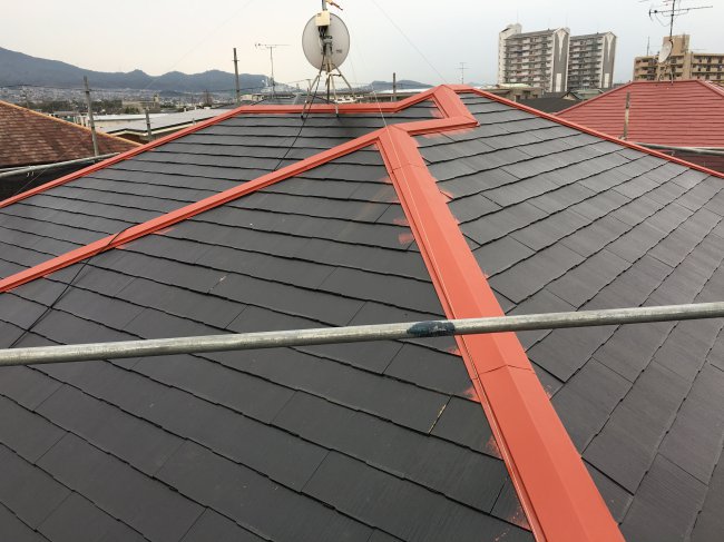 ![]() サイディングの腐食が進行してる部分は、撤去し貼り換えて塗装します。 | ![]() 屋根の棟板金部分はサビが酷かったため充分なケレンとサビトメ材を下塗りします。(赤色部分) |